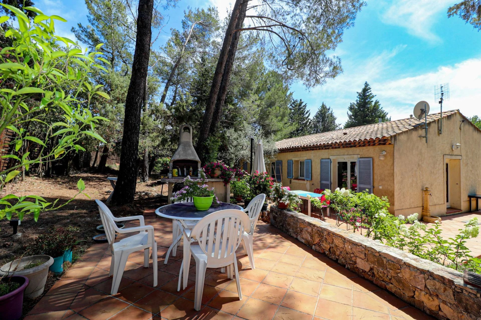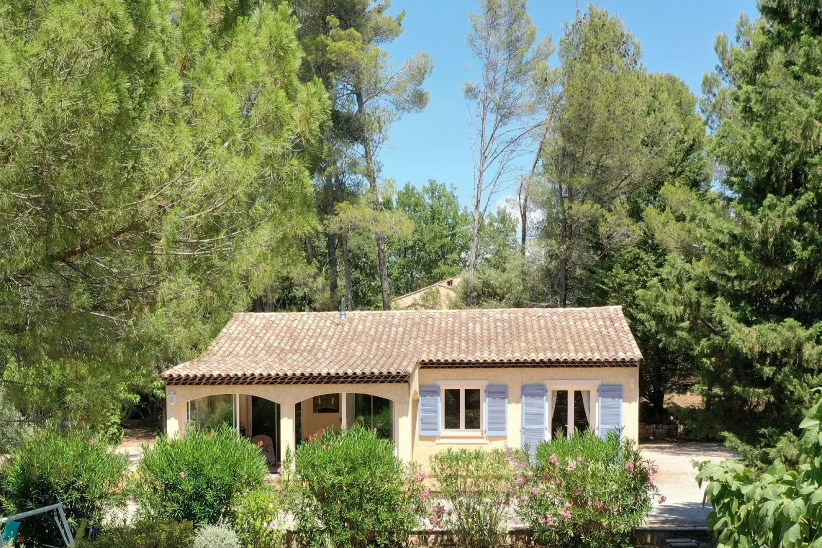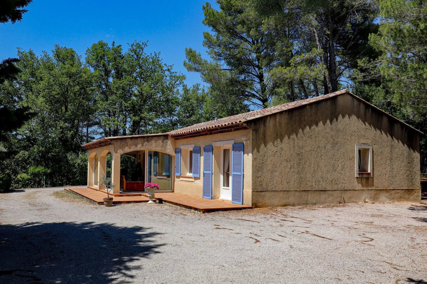 VENDU ! Flayosc, Exclusivité SOGIP - À la campagne, à moins de 2 km du village de Flayosc, jolie maison de plain-pied sur 1100 m² de terrain arboré et paysager avec 3 chambres. Le bien dispose d'un hall-dégagement avec placards, Séjour avec poêle à granules de 26 m² donnant sur une pièce de vie vitrée de 18 m², cuisine indépendante de 9 m², 2 chambres de 11 et 13 m², salle de bain, Wc, une 3ième chambre de 11 m² avec salle d'eau wc et accès indépendant. Assainissement à Réaliser, ce bien est issu d'un détachement de parcelle. Budget micro-station à prévoir. Très beau jardin de 1100 m², arboré et plat, terrasse et barbecue. Des travaux seront à prévoir. Libre au 30/10/2025. Une belle affaire à Flayosc. SOGIP l'agence historique du village.Caroline et Bruno à votre écoute.