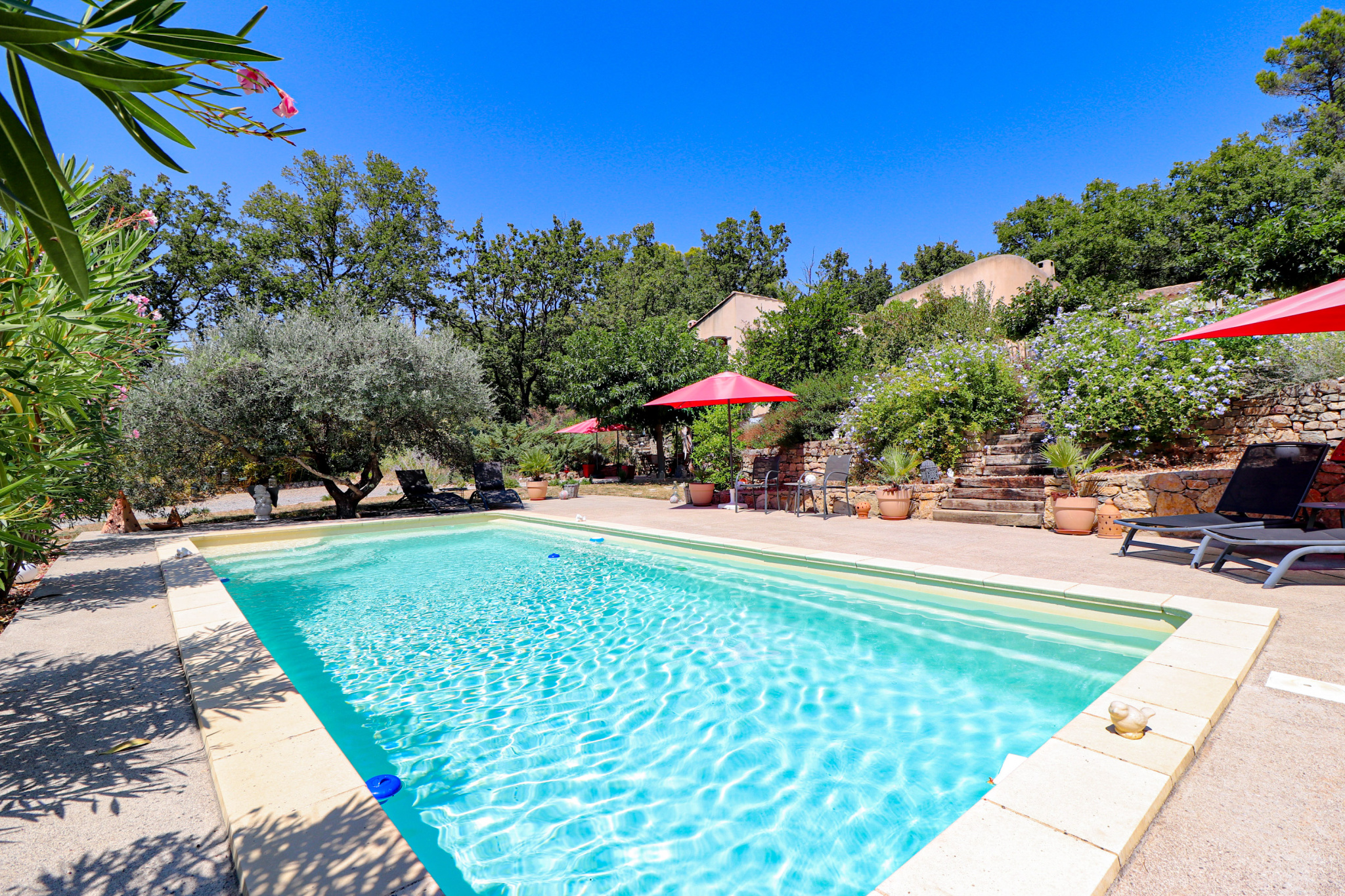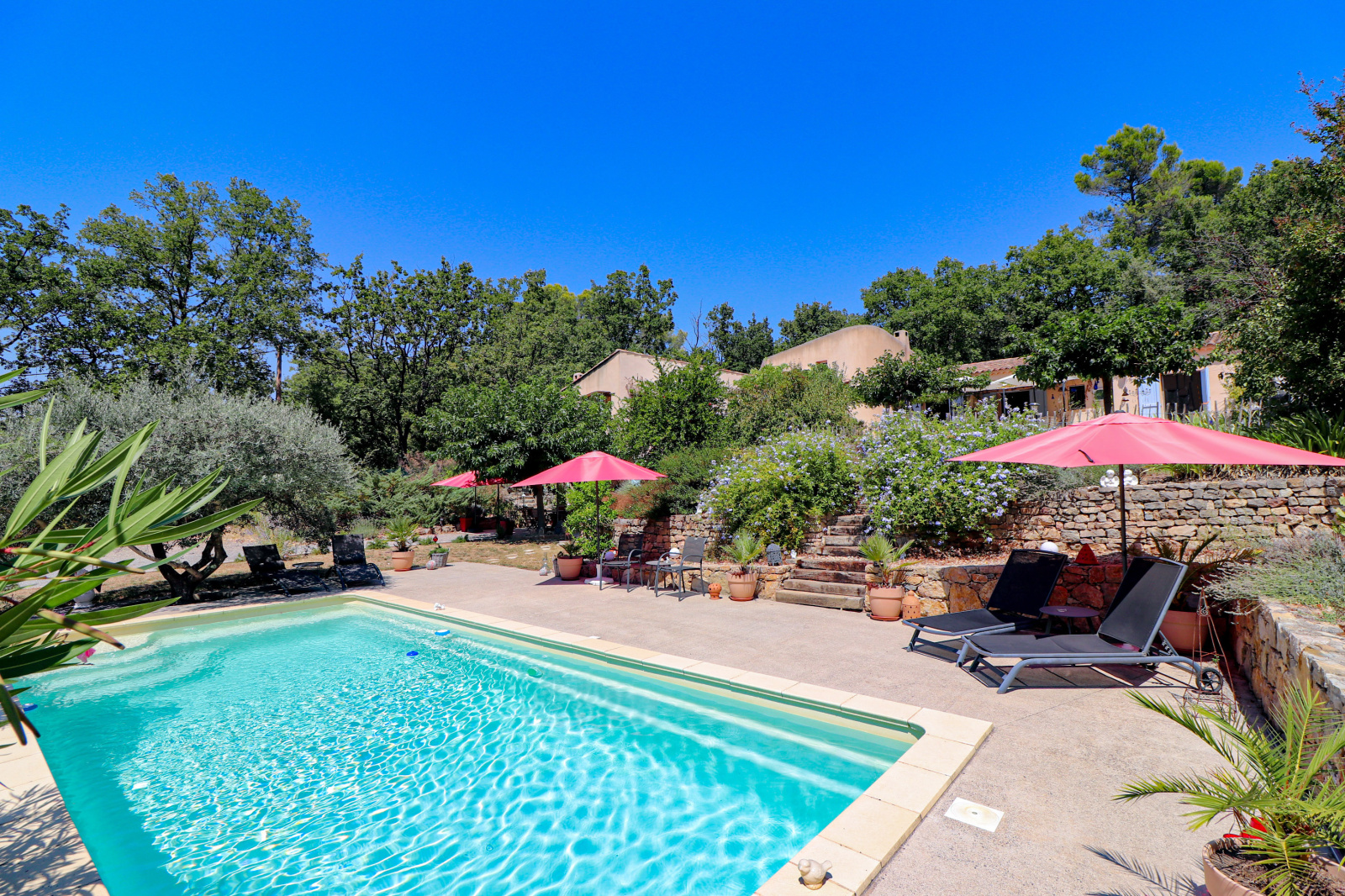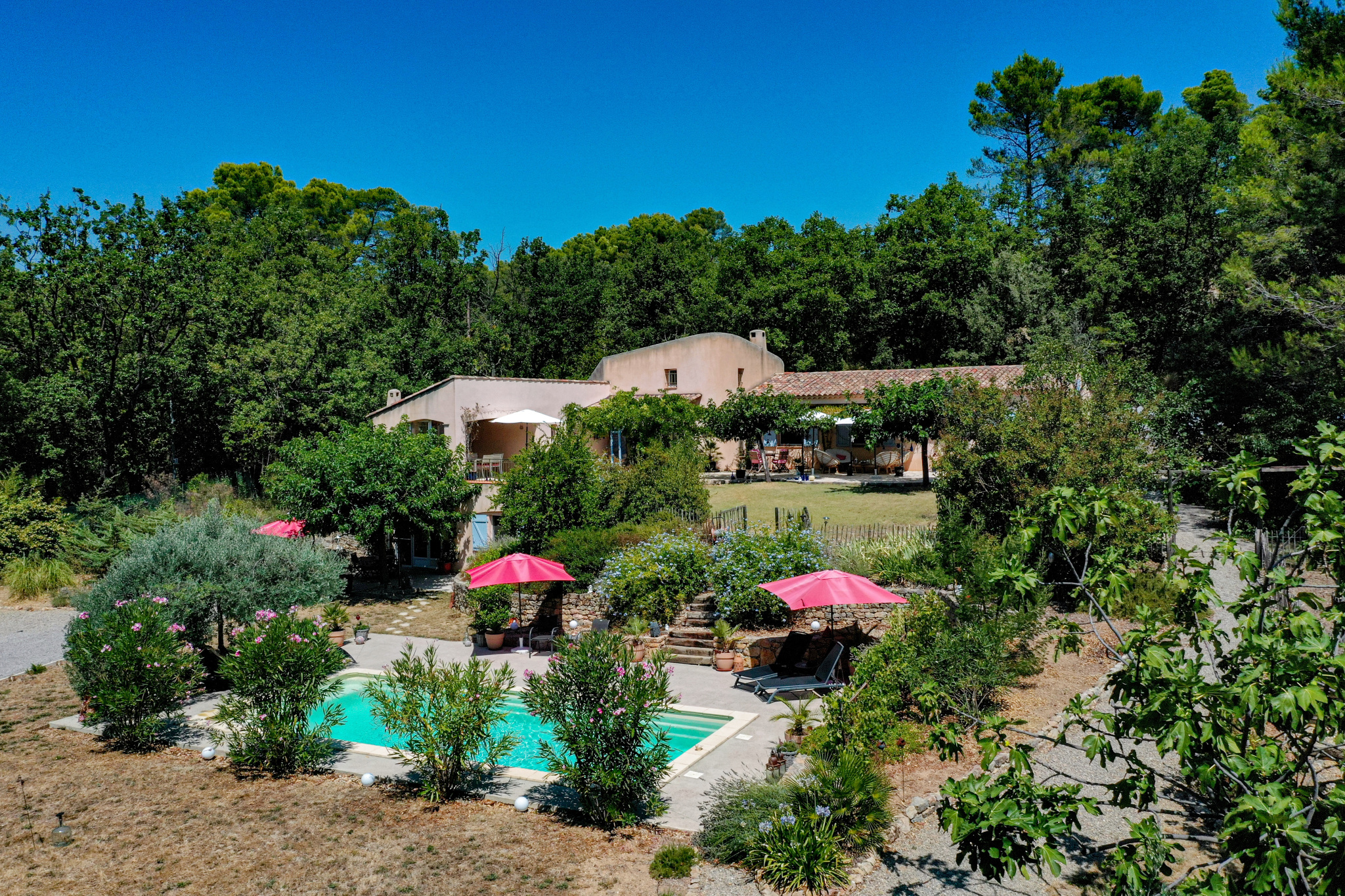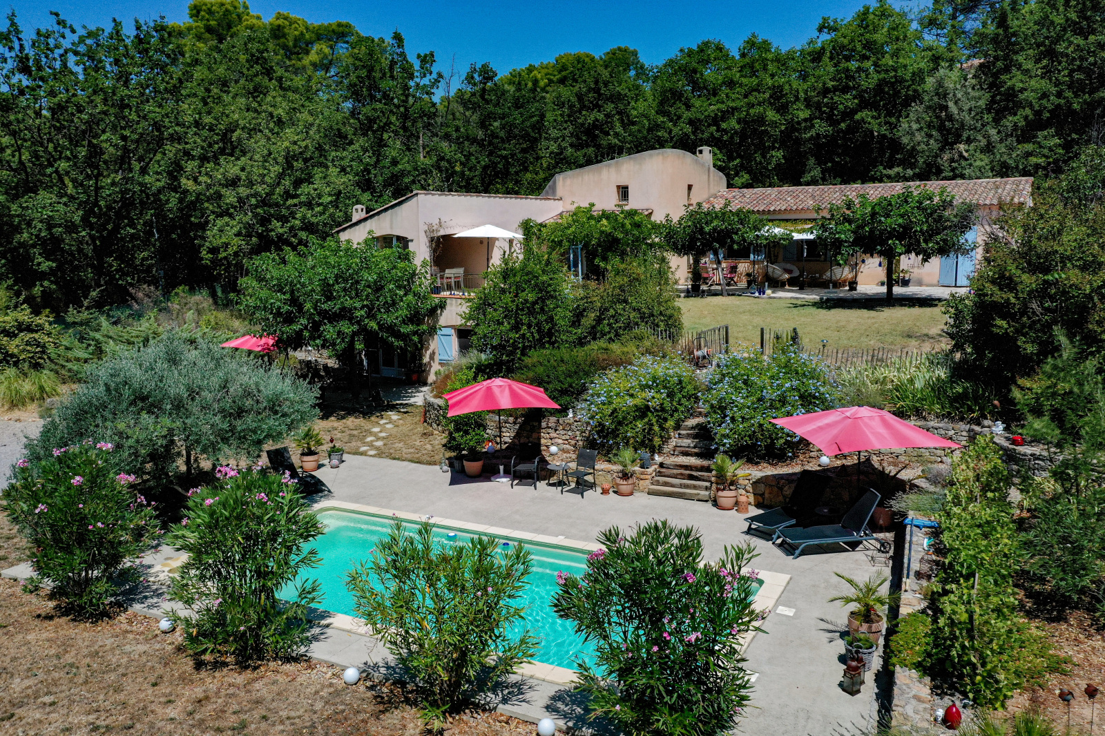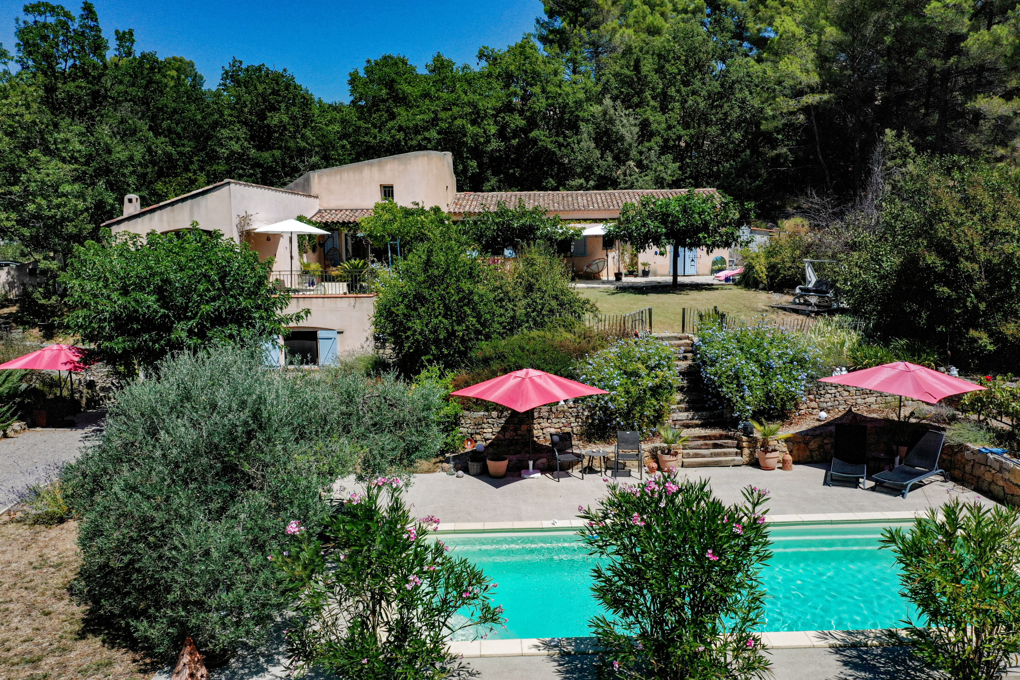 En dessous et donnant sur la piscine un superbe appartement indépendant meublé de 2 pièces avec séjour/cuisine équipée, et une chambre de 23m² salle d'eau et wc (idéal gîtes). Cave et vide sanitaire. Le jardin est superbe, planté d'espèces méridionales, oliviers, figuiers, chêne centenaire... Piscine de 9x4 avec plages autour. Différents abris de jardin, récupérateurs d'eau. Assainissement individuel récent. 2 accès possibles sur la propriété, portail automatique, adoucisseur eau... Beaucoup de potentiel. Un environnement de qualité, au grand calme et proche du village de Flayosc. Une très belle affaire ! SOGIP l'agence historique du village depuis 40 ans. Caroline et Bruno sont à votre écoute.